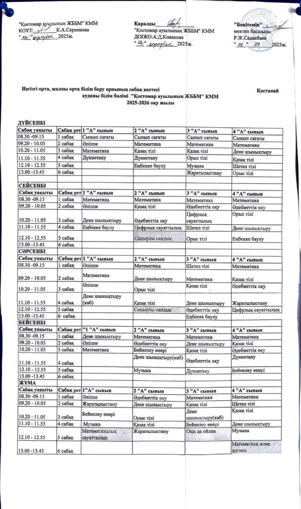 Сабақ кестесі 1-4 сынып