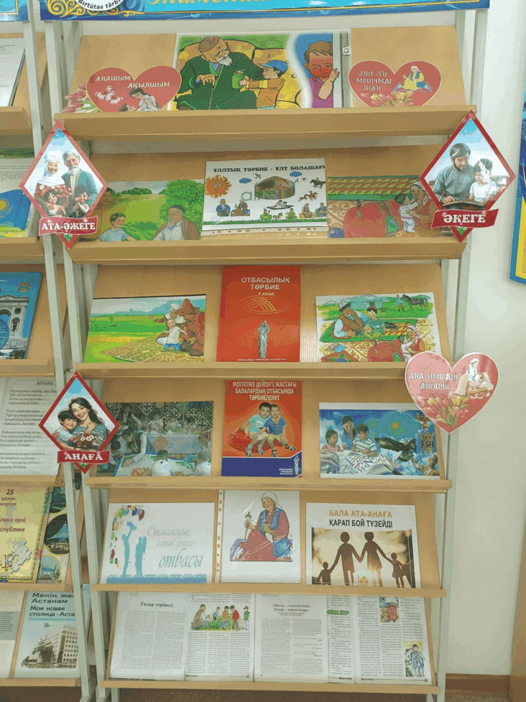 «Отбасы- бақыт мекені» тақырыптық сөре .Отбасы күніне орай мектеп кітапханасында бастауыш сынып оқушылары арасында ертеңгілік өткізілді.Кітап көрмесі жасалды.